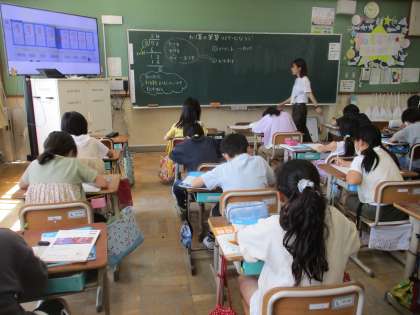 算数科「1けたでわるわり算の筆算」は、3年生で学習していたわり算を筆算で計算します。子どもたちは「1つずつ丁寧にすればいい」「3年生の復習をやっておこう」など言い、真剣に学習に取り組んでいました。