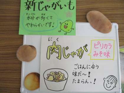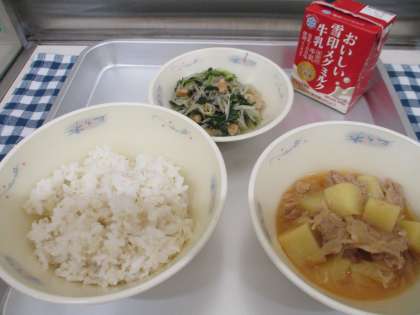 今日の給食の肉じゃがは、トウバンジャンをつかったピリッとからい味つけでした。1年生からは、「かっらー!!でもおいしい!」「ごはんとめっちゃ合う!」と好評でした。