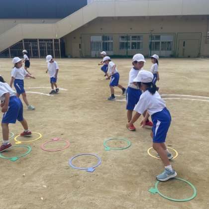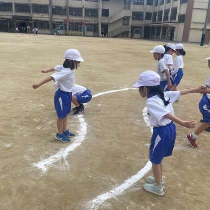 体育科では、けんけんぱや、川とび、ゴムとびなど、いろいろなとびあそびをしました。「うでを大きくふると遠くまでとべるよ」「足をまげるとバネのように高くとべるよ」とアドバイスしながら楽しんでいました。