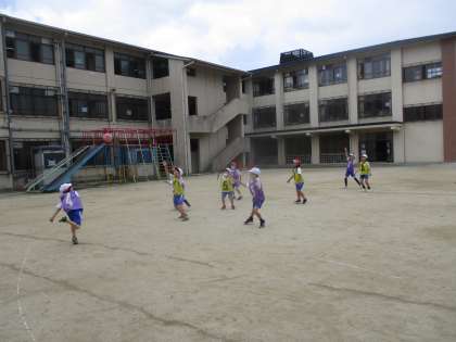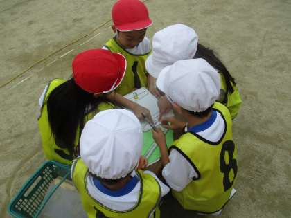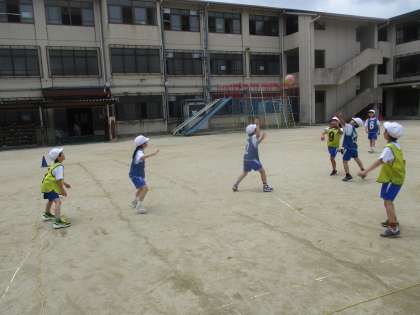 体育科の学習では「エンドボール」の学習が始まりました。2年生の時の学習した「パスゲーム」とは違い、ゴールマンとガードマンがいて、全員がよりシュートが決まるように工夫して動くことが大切になりました。今日の学習では、チームの人が投げるのが上手なのか、パスが上手なのか見ながら、学習を楽しんでいました。