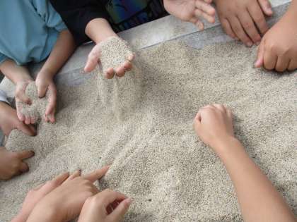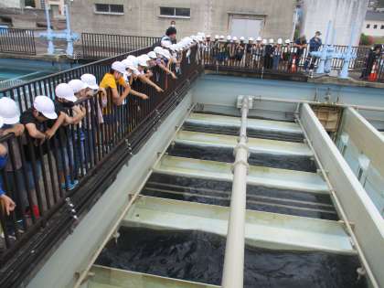 社会科「水のゆくえ」の学習で、松ヶ崎浄水場へ見学に行きました。ろ過する工程を見たり、ろ過をするときに使われていた砂を触ったり、流れる水を匂ったりしました。子どもたちは、「藻みたいなのが浮いている」「さらさらの砂だ!」「プールみたいなにおいがする」など、感じたことをつぶやきながら見学をしていました。