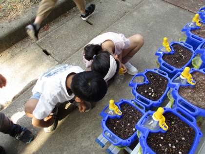 朝顔の種の水やりを頑張っています。朝の準備を素早くして、「朝顔の水やりいってきます!」と元気に外へ。芽が出た子もいて大喜びです!