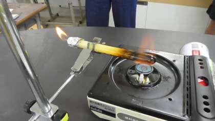 この試験管を実験用ガスコンロで加熱し続けるとどうなるか。