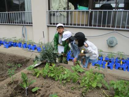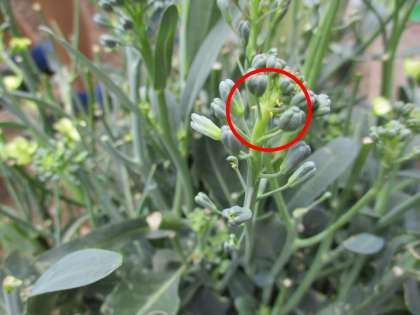 畑でヒマワリやダイズなどの観察をしているときに、別の植物についていた2種類のたまご(?)を発見して教えてくれました。