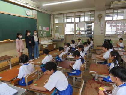 6年生からお祝いのメダルをもらい、手をつないで一緒に入場しました。