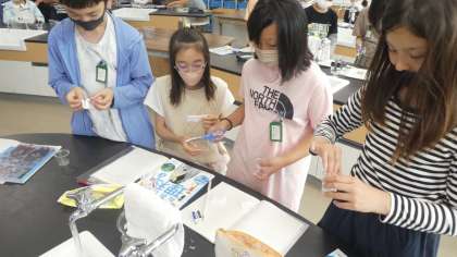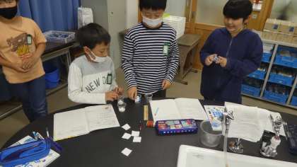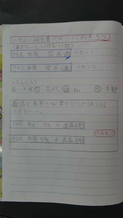 温度、水、空気、日光、肥料など、いくつかの条件について、各班相談しながら実験の用意をしていました。