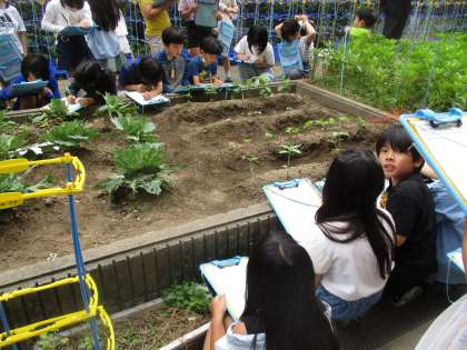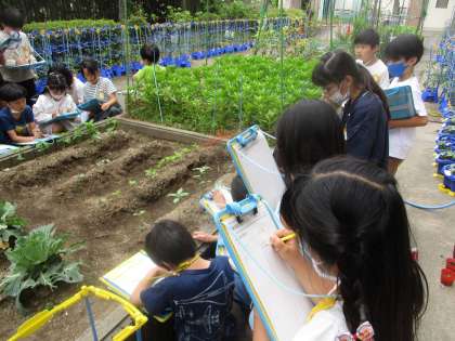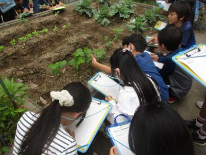 学校園で育てている植物がどんどん育ってきています。大豆やヒマワリは10cmをこえて、前と比べて違うところや予想と違うところを中心に観察を進めています。