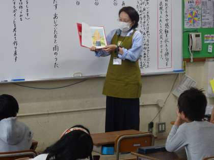 今朝は、PTA読み聞かせの会の方に来ていただいて