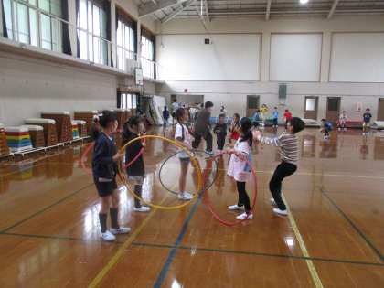 週に1回、3年生は金曜日の中間休みに体育館あそびをしています。フラフープやバスケットボール、柔らかいボールなどを使って楽しく遊んでいます。