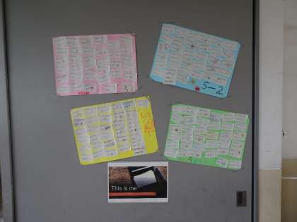 外国語の学習で作った「名刺」を5年生の廊下に掲示しています。
