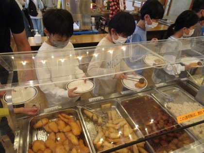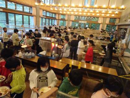 バイキング形式で食べるものを選んで、班の友だちと一緒に食べました。