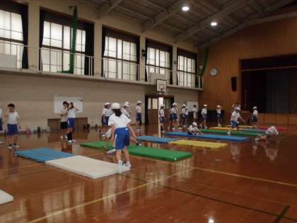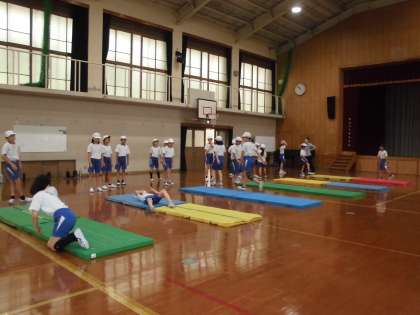体育科では、マット運動の学習をしています。技カードや動画で動きを確認し、それぞれがめあてにしている技の完成にむけて取り組んでいます。「もう少し足を高く上げるといいよ。」「ひざが曲がっているから真っすぐのばすといいよ。」と、互いに見合いアドバイスし合いながら学習しています。