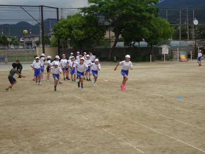 陸上部は基本の運動から、体づくりの運動、ハードル走などをしています。