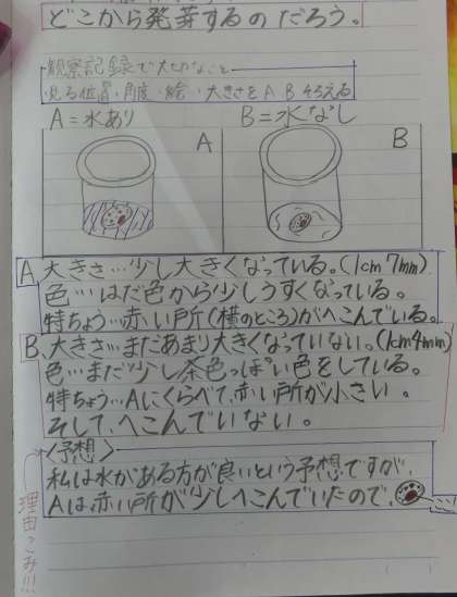 変化のないものや、水を吸って膨らんでいるもの、すでに発芽が見られるものなど、結果が出はじめています。