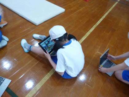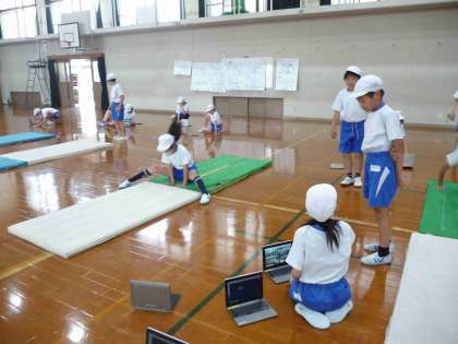 体育の学習でマット運動に取り組んでいます。ねらい(1)では、自分の技の様子をタブレットで撮影し、どうすればさらに上手になるか考えたり友達とアドバイスをしあったりしています。ねらい(2)では、いろいろな道具を使いながら難しい技に取り組んでいます。最初に取り組んだ時よりも、レベルアップしたと感じている子どもたちがたくさんいました。