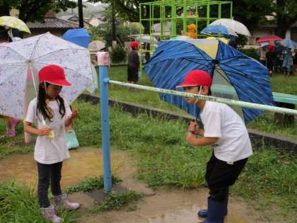 「ざーざーって音がする!」「昼間のホタルみたいにしずくが光っている!」と感想を言いながら、雨の日の探検を楽しんでいました。