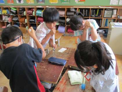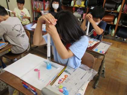 理科「とじこめた空気や水」では、空気や水をとじこめ、力を加えると、体積や手ごたえはどうなるのかを学習しました。子どもたちは「目に見えない空気だけれど、とじこめておすとこんなに手ごたえが強くなるんだ!」「水はどうなるんだろう?」と話し合いながら学習に取り組んでいました。
