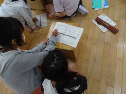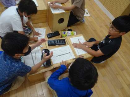 音色の組み合わせやリズムの重なり方を工夫しながら、グループでリズムを考えています。