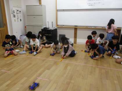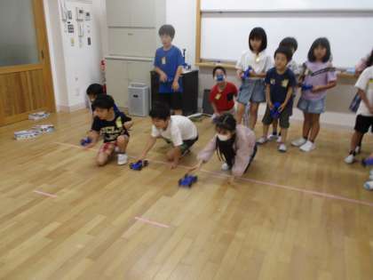 理科の学習では「ゴムと風のはたらき」の学習を進めています。ゴムの強さで車の進む距離は変わるのか、風の強さで車の進む距離は変わるのかなど、予想を立てたら、実際に車を走らせてみて、結果を確かめながら学習を進めています。子どもたちはみんな楽しそうに学習に取り組んでいます。