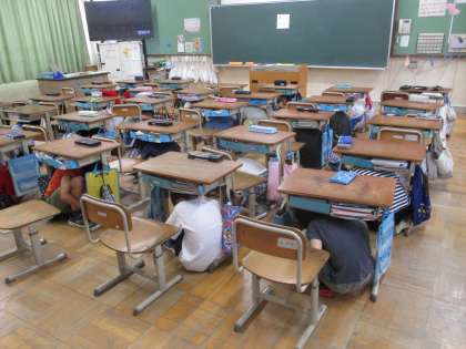 本日は引き渡し訓練にご参加いただきありがとうございました。地震が起こった際の子どもたちの行動も迅速ですぐに机の脚をもち、机の下にもぐっていました。