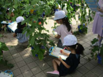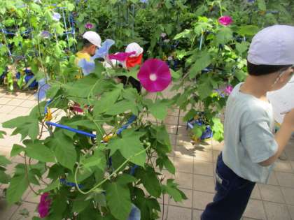 大事に育てている朝顔もどんどん花が咲き始めました。子どもたちの背より高いつるがのびています。紫色の花・ピンクの花・水色の花・・・いろんな色があっていいですね。