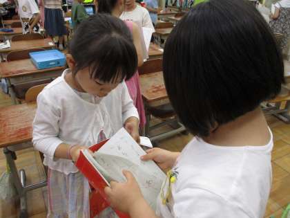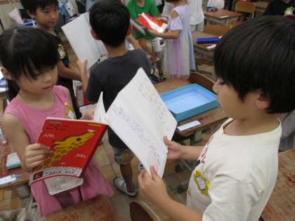 国語科の学習の時間に、自分の好きなものとそのわけを伝え合いました。好きなものは、遊びや動物、食べ物など様々で、友達の「好き」をたくさん見つけていました。好きなものの絵も見せ合い、とても楽しそうに交流していました。