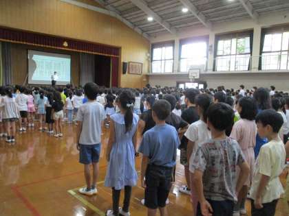 体育館で始業式を行いました。4年生は音楽の授業で校歌を練習していたので、美しい声で校歌を歌うことができていました。また、子どもたちは校長先生の話を真剣に聞いていました。まだまだ暑い日が続きますが、4年生のパワーで乗り越えていってくれることでしょう。