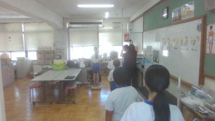計測の前には、養護教諭の田中先生から元気に過ごすために大切なことについてのお話がありました。睡眠や食事をしっかりとることや、お風呂にゆっくり浸かること、寝る直前のブルーライトを控えることが大切だと教えていただきました。