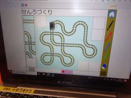 算数科でタブレットを使ってプログラミングで線路づくりの学習をしました。自由にカードを動かしてオリジナルの線路を作れるので、みんな夢中になっていました。