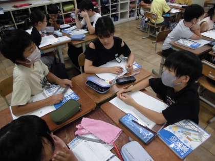 算数科「整数」では、公倍数のみつけ方について考えました。「数直線を使わずに公倍数をみつけるには、それぞれの倍数を書き出したらいいよ。」「最小公倍数の倍数になっているから、まずは最小公倍数をみつけたらいいね。」と、話し合いました。