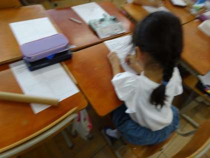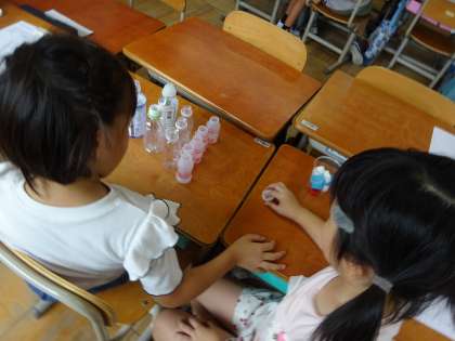 生活科の「あそんでためしてくふうして」の単元で、動きに注目して遊びました。今日の動きは「ふく」「はじく」「転がす」です。つつでペットボトルのキャップを吹いて遊んだり、筒の中にペットボトルのキャップを転がして遊んだりしました。自然と数人で集まって「こうしたほうがいいんちゃう?」とアイデアを出し合いながら楽しむ様子が見られました。面白かったあそびはワークシートにしっかりとメモしました。次の遊びが楽しみです。