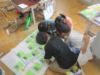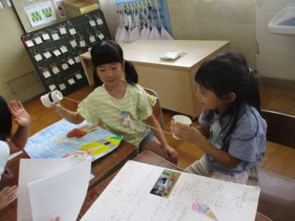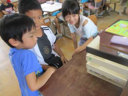1年生たちの夏休みの自由研究・工作は,力作ぞろい。みんなに頑張ったところやみてほしいところなどを紹介しました。とても満足している様子でした。
