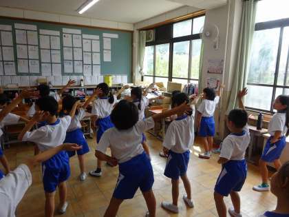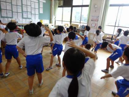 振り付けを覚え始めたので、お手本の映像を見ずに踊る練習を始めています。「右か左か分からなくなる。」と迷っている様子も見られましたが、1つ1つ確認しながら練習しました。お家でも練習している、との声もよく聞こえます。ご協力、ありがとうございます。
