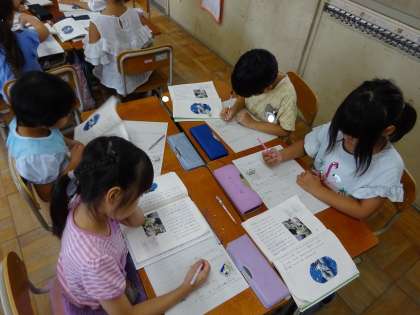 国語科では、動物園のじゅういさんの仕事やその仕事の工夫について本文をしっかりと読んでいます。グループで「〜からです。と書いてあるから、ここに理由があるんじゃない。」「これは理由ではなく、工夫だね。」と話し合いながら学習を進めています。みんなしっかりと教科書を見て考えていました。