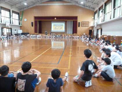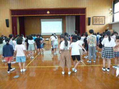 若狭宿泊学習に向けてキャンプファイヤーで踊るフォークダンスの練習をしました。音楽に合わせてリズムをとる練習や足の動きなどを確認しました。楽しいキャンプファイヤーになるように各学級でも練習を進めていきます。