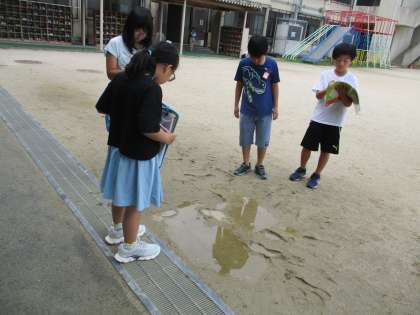 理科の学習では、雨水のゆくえについて学習しています。雨が降った運動場には、水たまりがたくさんできます。しかし、あっという間に消えてしまいます。子どもたちは「砂にしみ込んだ」「植物の方へ流れていき、植物が吸い込んだ?」など、様々な予想をたてました。さあ、水たまりの水はどこへ消えたのでしょうか?