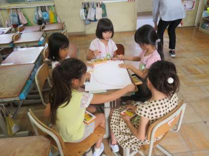 毎日外で楽しく遊んでいる子が多いです。朝顔の種取に夢中になっている子もいます。教室で楽しく絵をかいて遊ぶ様子も見られています。