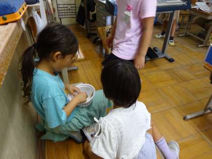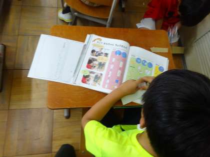 今日は切り込みを入れたり、テープでとめたりして動くおもちゃ作りに挑戦しました。先生に作り方を聞くのではなく、教科書を見て考えたり、試しては相談したりして作りました。おもちゃが動いた時には歓声を上げて喜んでいました。