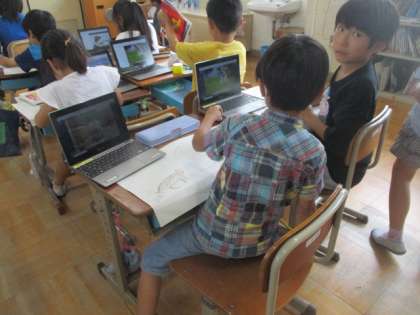 お話に出てくる動物の写真を見ながら描いてみました。一人一台GIGA端末。効果的に使っています。