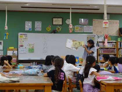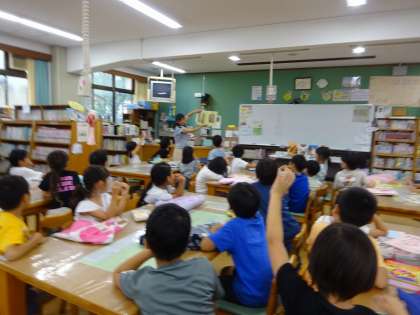 週に1度の読書の時間は子どもたちに大人気です。今日は、図書館司書の宮城先生に「あしあと図鑑」からクイズを出してもらって盛り上がりました。読み物だけでなく、自分の興味のある本を見つけても楽しいですね。