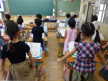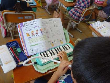 音楽の学習では「山のポルカ」の演奏に取り組みました。新しい曲に入るときには、指使いで気をつけるところを楽譜にチェックし、間違えないようにしています。うまく弾けるように練習をしていきたいです。また、今の季節にぴったりの「とんぼのめがね」を歌いました。夕焼け雲の中を飛ぶトンボを想像しながら気持ちよく歌うことが出来ていました。