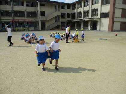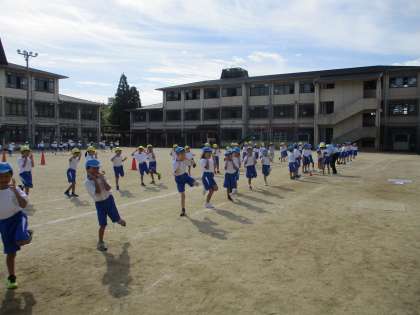体育の時間に運動会練習をしています。デカパンリレーでは、2人の息が少しずつ合うようなってきて、スピードも速くなってきています。色関係なく、応援し合っている姿がとても素敵だなと思います。