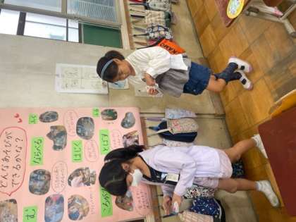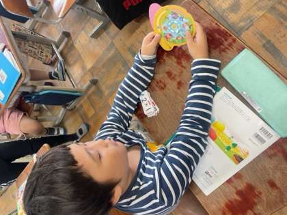 算数では、かけ算の学習を進めています。今日までに5の段,2の段,3の段の九九の練習をしました。クラス全員で上がり九九、下がり九九、ばらばら九九を確認。九九の円盤を使ったり、歩きながら九九カードをめくったり…工夫しながら覚えています。