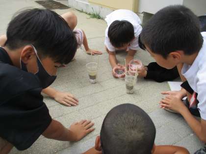 運動場や砂場の砂をカップに入れ、水がしみ込むのか、実験しました。