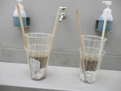 すると、しみ込むだけではなく、砂の粒の大きさによってしみ込む速さが違うことにも気づくことができました。