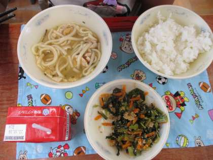 今日は、あっつあつのかやくうどん!「かやく」は漢字で「加役」と書き、主役になる食材に加える食べものという意味があります。今日のかやくうどんにも、うどんをおいしくするために5つの「かやく」が入っていました。「青ネギ、これかな?」「しいたけ見つけた!」と一生懸命探しながら食べている人もいましたね。見つけられましたか?うま味たっぷりのおだしとうどんがよく絡み、おいしかったですね!運動会の練習で疲れた体も元気になりますように!