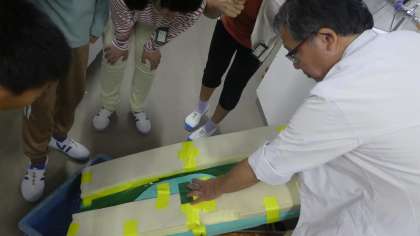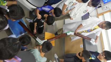 今回は、「水の流れが曲がっているところで、流れの内側と外側とで、流れる速さに違いがあるか。」について、考えました。