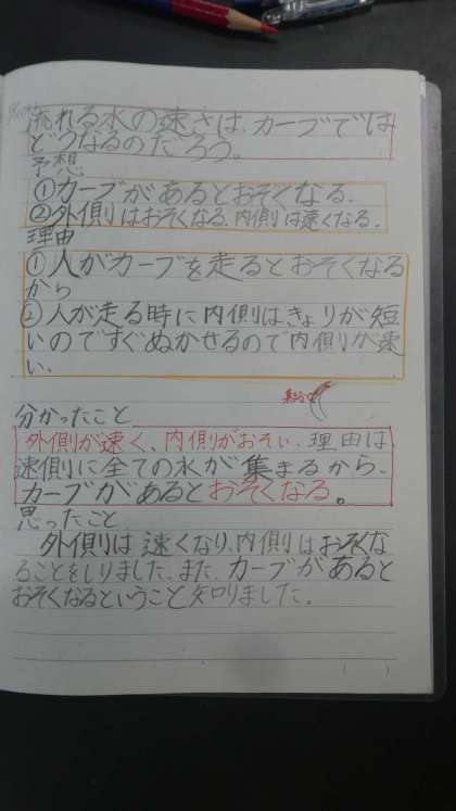 みんな、自分がカーブを曲がるときの経験や、外側と内側のきょりの違いなどから、流れの速さの違いについて意見を出し合っていました。