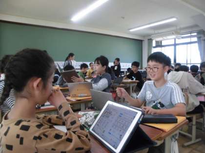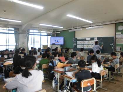外国語科「He can run fast.She can do kendama.」の学習では、学校の先生方にできることやできないことを尋ねるために学習を進めています。今日は、先生方にインタビューをするときに使う英語の表現を確認し、友達とできることやできないことを尋ね合いました。「自分の好きなものも一緒に伝えたらどうかな?」「答えてもらったらリアクションが大切だな。」と、よりよいインタビューにするためにどのようにしたらいいのかを話し合いました。