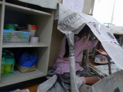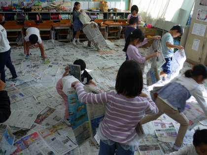 図画工作科で「しんぶんしとなかよし」の学習をしました。新聞紙を教室中に敷き詰めてみたり、新聞紙で好きな物を作ったりしました。服を作ったり、家を作ったり、バスケットゴールを作ったりと想像力を広げて楽しんでいる様子が見られました。